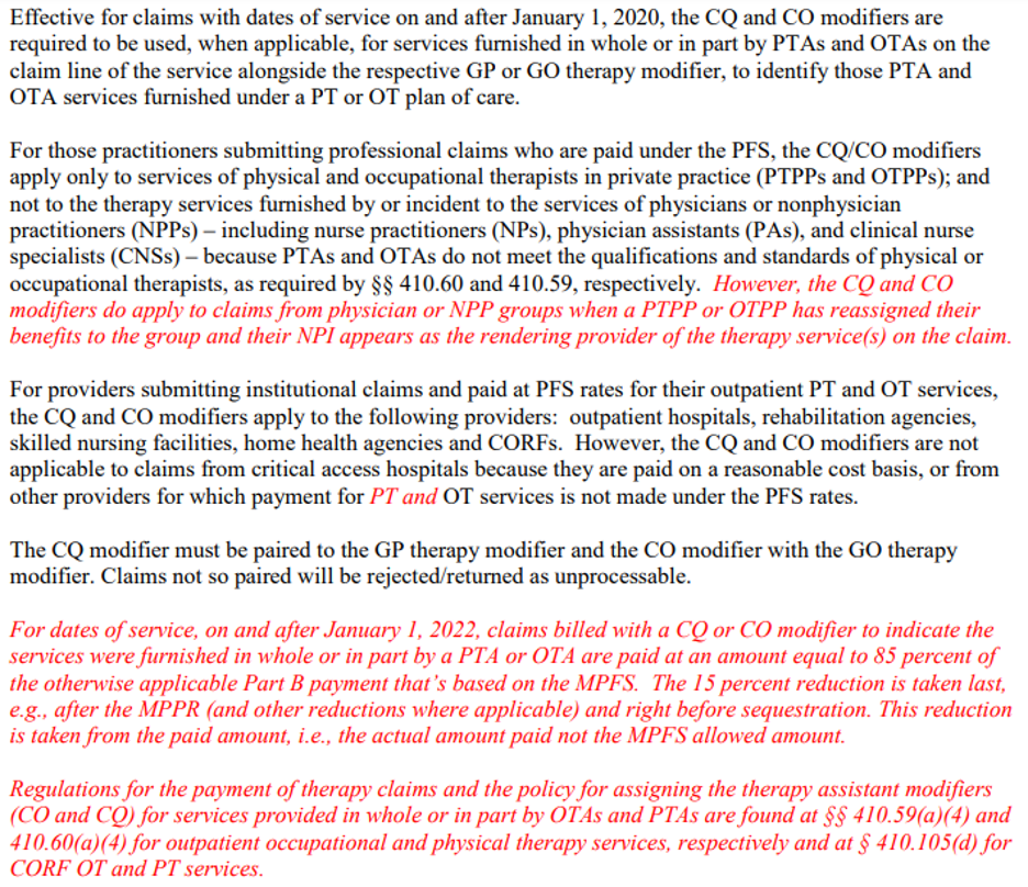 The red ink for the Medicare Claims Processing Manual Chapter 5 – Part B Outpatient Rehabilitation and CORF/OPT Services begins on page 9 of the 11-page transmittal. You’ll also find general information regarding these changes starting on page 3.