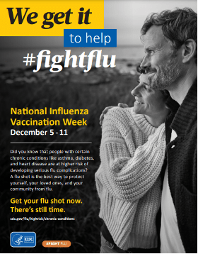 December 5 – 11, 2021 is National Influenza Vaccination Week. Have you gotten this year’s flu shot? Did you know that people with certain chronic conditions like asthma, diabetes, and heart disease are at higher risk of developing serious flu complications? A flu shot is the best way to protect yourself, your loved ones, and your community from flu. What are you waiting for? There’s still time and time is of the essence!