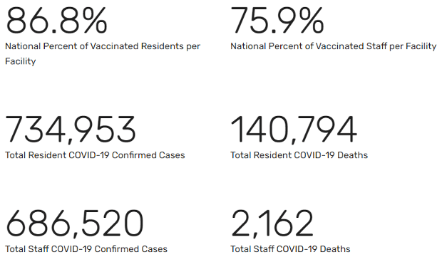 View the list of every nursing home with recent resident and staff vaccination rates and other data. This data is current as of the week ending November 28, 2021. Keep up the good work – lives depend on it!!