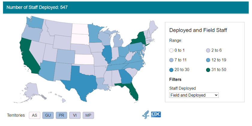 Staffing Resources and Guidance was also updated December 14, 2021. As of this date, there are a total of 547 CDC staff currently working in state, tribal, local and territorial health agencies as reflected on this map (the number of such staff can change daily):