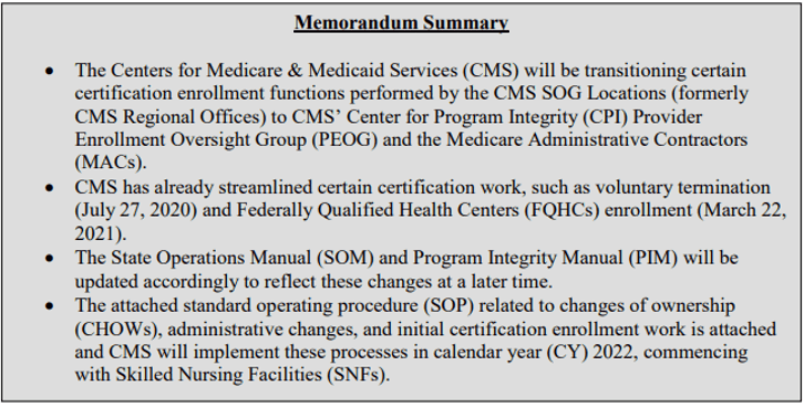 Effective Date: The transition of certification enrollment work related to the processing of CHOWs, administrative changes, relocations, and initial certification will be released in segmented phases by provider/supplier type. The first segment will commence on January 3, 2022, for Skilled Nursing Facilities (SNFs). CMS will release subsequent provider/supplier types addendums at a later time. This guidance applies to applications received or recommendations for approval or denials made on or after January 3, 2022.