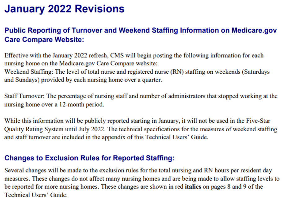 - Weekend Staffing and Turnover will be added to the Care Compare website in January 2022 and used in the Nursing Home Five Star Quality Rating System in July 2022.