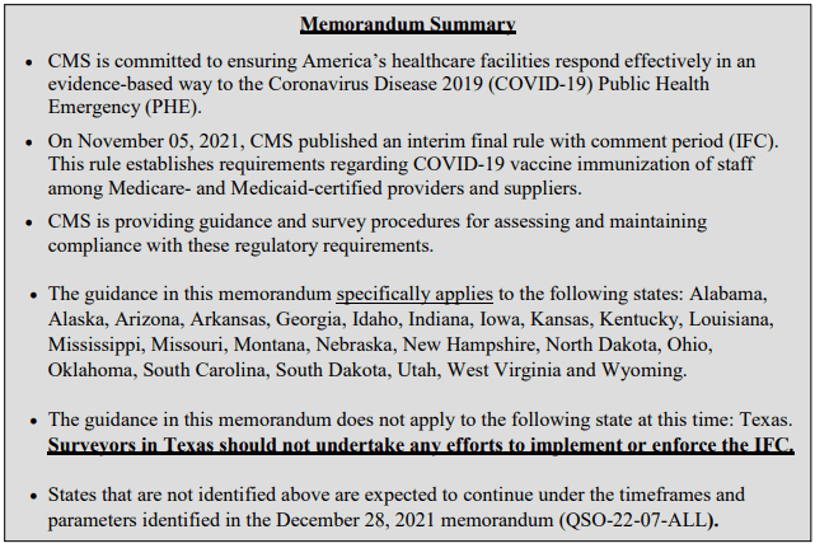 The remaining state not covered by the Omnibus COVID-19 Health Care Staff Vaccination regulation – Texas – is still covered by a separate preliminary injunction issued in a district court there.