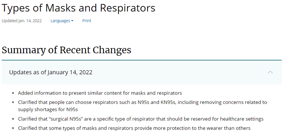 On Friday, January 14, 2022, CDC updated the consumer webpage describing the types of masks and respirators used to prevent the transmission of SARS-CoV-2. Masking is a critical public health tool to prevent the spread of COVID-19, and it is important to remember that any mask is better than no mask. To protect yourself and others from COVID-19, CDC continues to recommend that you wear the most protective mask you can that fits well and that you will wear consistently.