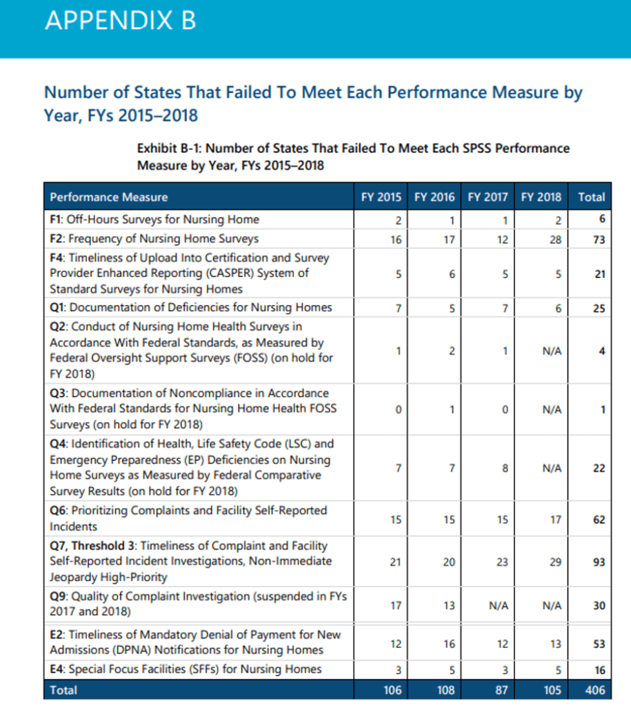 (OIG) analyzed CMS oversight of 52 States (including Puerto Rico and the District of Columbia) during FYs 2015-2018 to identify. (OIG) conducted interviews with CMS staff at the central office and 10 regional offices during February and March 2020, to learn how they work with States to address serious problems with survey performance and any challenges that States may face. (OIG) also collected and analyzed documents from CMS about State performance and CMS imposition of remedies and sanctions on States with poor performance.