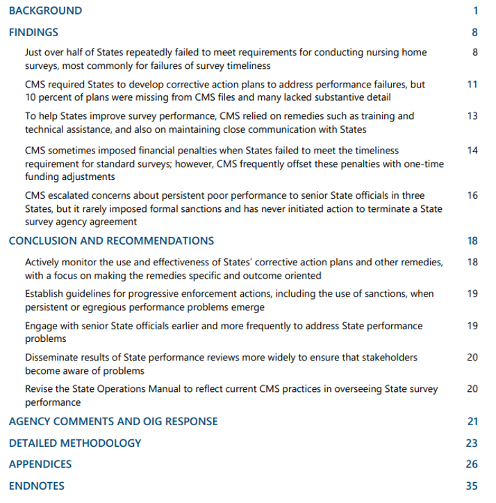 CMS oversees how State survey agencies (States) conduct surveys of nursing homes to assess the homes’ compliance with Federal requirements. Recent work by OIG has found problems with performance by some States, which raise questions about the effectiveness of CMS oversight of State performance in conducting nursing home surveys, and the ability of CMS to hold States accountable when problems arise.