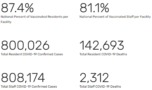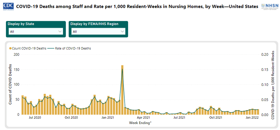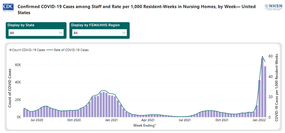 The NHSN Nursing Home Covid-19 Data Dashboard provides this data as of January 17, 2022 at 5:30am ET (note the very sharp increase in both staff and resident cases – not good!):