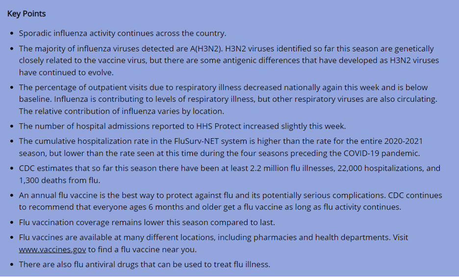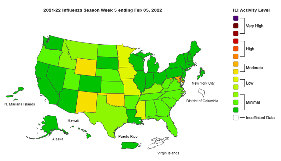For week 5, ending on February 5, CDC’s Weekly U.S. Influenza Surveillance Report, FluView summary reports sporadic influenza activity continues across the country. The percentage of outpatient visits due to respiratory illness has decreased nationally and is below baseline, however, the number of hospital admissions due to flu has increased slightly this week. CDC estimates that so far this season there have been at least 2.2 million flu illnesses, 22,000 hospitalizations, and 1,300 deaths from flu. The next data update is scheduled for Friday, February 18, 2022.