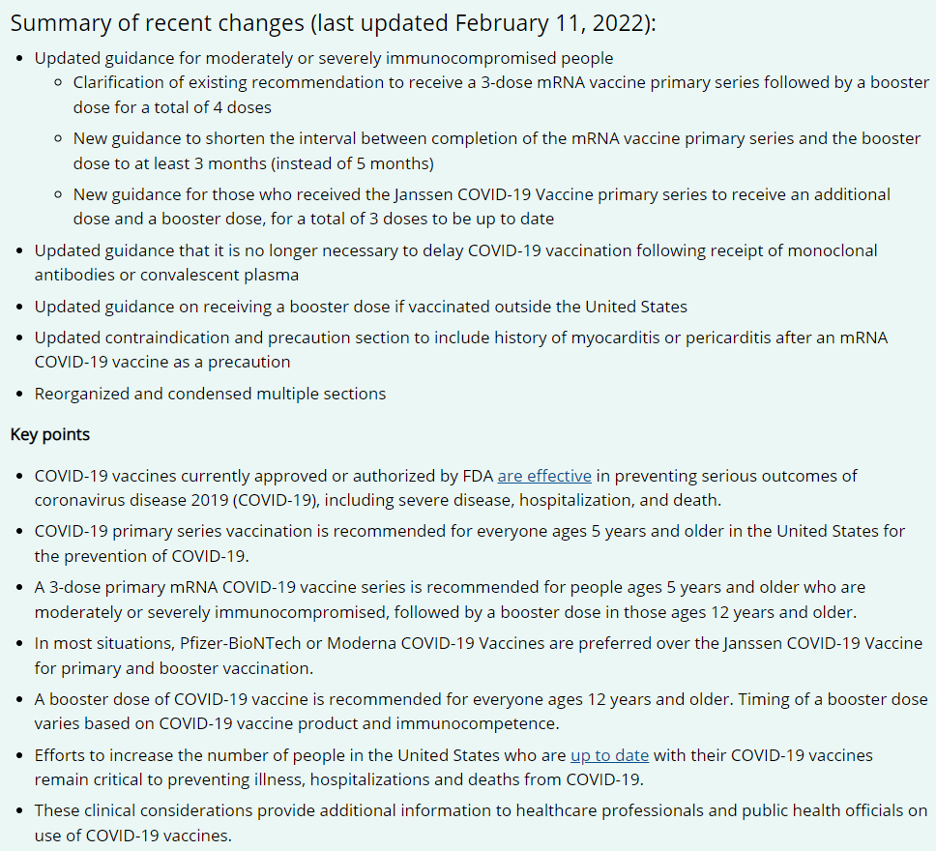February 11, 2022…CDC updated Interim Clinical Considerations for Use of COVID-19 Vaccines Currently Approved or Authorized in the U.S.: