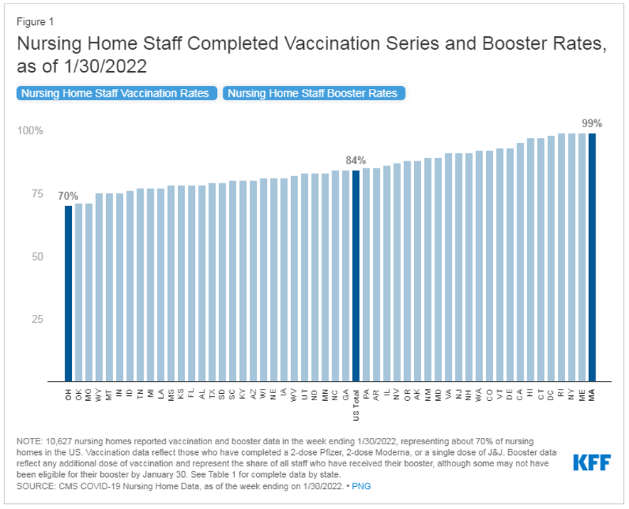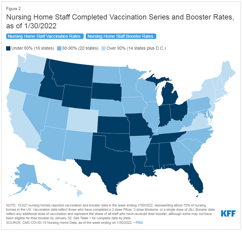 “This data note presents completed vaccination and booster rates among nursing home staff, by state. This analysis does not categorize states or facilities by compliance since deadlines for all states have not passed and facility-level data is lagged. This analysis presents data on completed vaccinations at the state-level rather than at the facility-level, though this policy will be enforced at the facility-level. Future analyses will evaluate the share of facilities in each state in compliance with the rule once compliance deadlines for both doses have passed.”