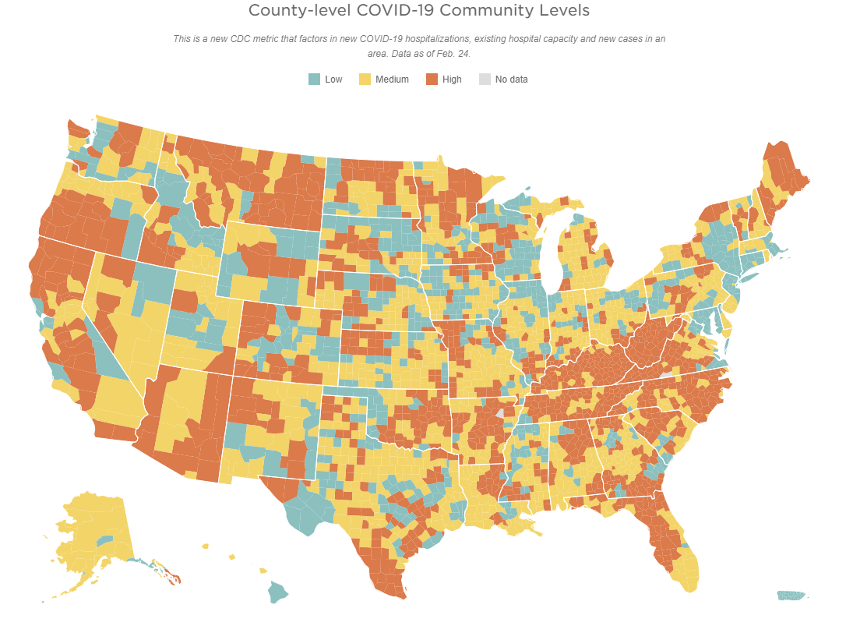 “The Centers for Disease Control and Prevention announced Friday it is relaxing its mask guidance for communities where hospitals aren’t under high strain. Under the new guidance, nearly 70% of the U.S. population lives in an area considered to be low or medium risk, and residents there are advised they can go indoors without masks.