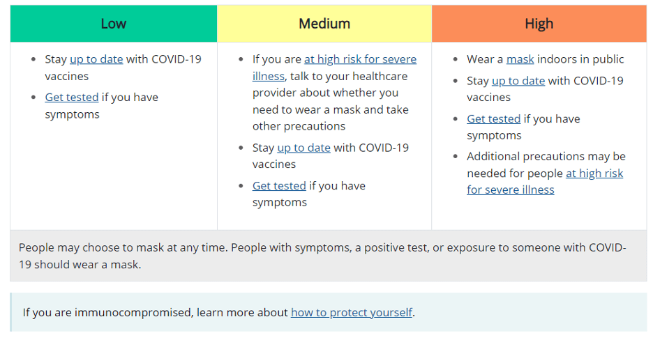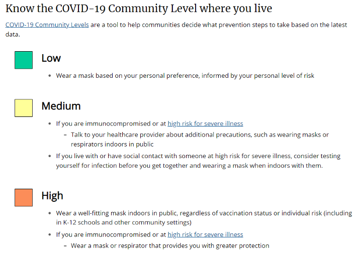 “COVID-19 Community Levels are a new tool to help communities decide what prevention steps to take based on the latest data. Levels can be low, medium, or high and are determined by looking at hospital beds being used, hospital admissions, and the total number of new COVID-19 cases in an area. Take precautions to protect yourself and others from COVID-19 based on the COVID-19 Community Level in your area.”