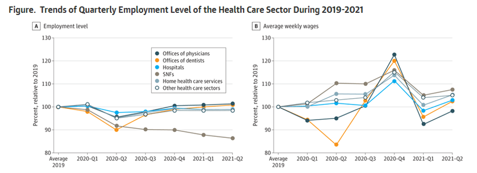 “The COVID-19 pandemic has disrupted the US health care workforce owing to changes in the use and finances of health care clinician offices and institutions, increased health risks, burnout from increased patient burdens, and child care disruptions.1–4 While federal programs have provided financial assistance to hospitals and institutions,1 the net effect of these forces on health care employment levels and wages has not been examined. Understanding trends in employment levels by health care settings and locations is critical for planning and responding to public health crises.