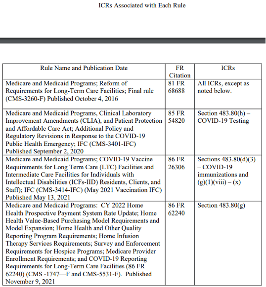 For the current or 2022 information collection request (ICR), we have provided updates to the burden in the 2019 ICR, as well as provided burden estimates for all of the new ICs finalized since 2016 that were in effect as of May 2021. The ICRs and the rules they were finalized in are indicated in table below.