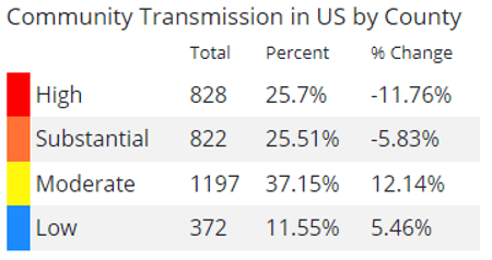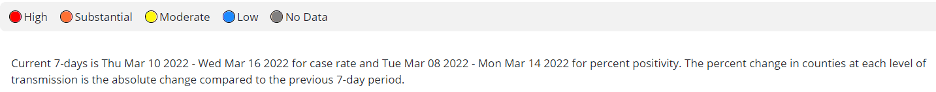Remember that healthcare facilities use the community transmission levels data and NOT the community levels data (shown above) for testing and other IPC requirements/recommendations.