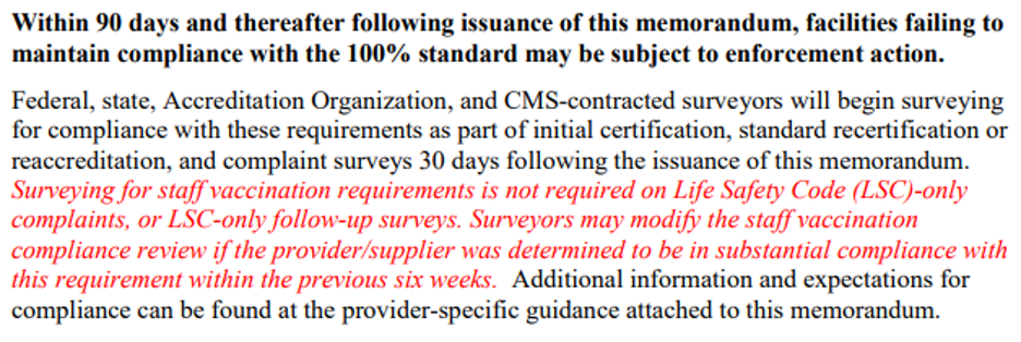 “This attachment is a supplement to and should be used in conjunction with the following memoranda: QSO-22-07-ALL-Revised, QSO-22-09-ALL-Revised, and QSO 22-11-ALL-Revised memorandum: Guidance for the Interim Final Rule – Medicare and Medicaid Programs; Omnibus COVID-19 Health Care Staff Vaccination. While the memoranda noted above apply to specific states, the regulations and guidance described in this attachment apply to all states. Implementation of this guidance will occur according to the timeframes and parameters identified in either QSO-22-07-ALL-Revised effective December 28, 2021, QSO-22-09-ALL- Revised effective January 14, 2022, or QSO-22-11-ALL-Revised effective January 20, 2022.”