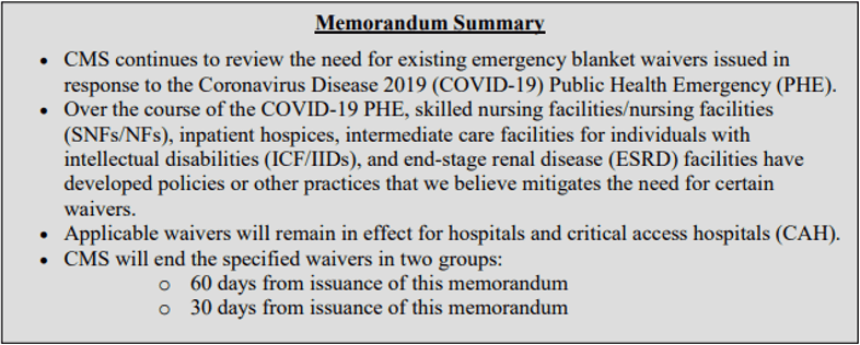 Emergency Declaration Blanket Waivers Ending for SNF/NFs 30 Days from Publication of this Memorandum: