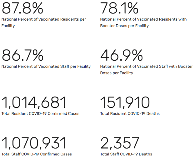 The NHSN Nursing Home Covid-19 Data Dashboard provides this data as of April 11, 2022, at 5:30am ET: