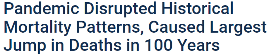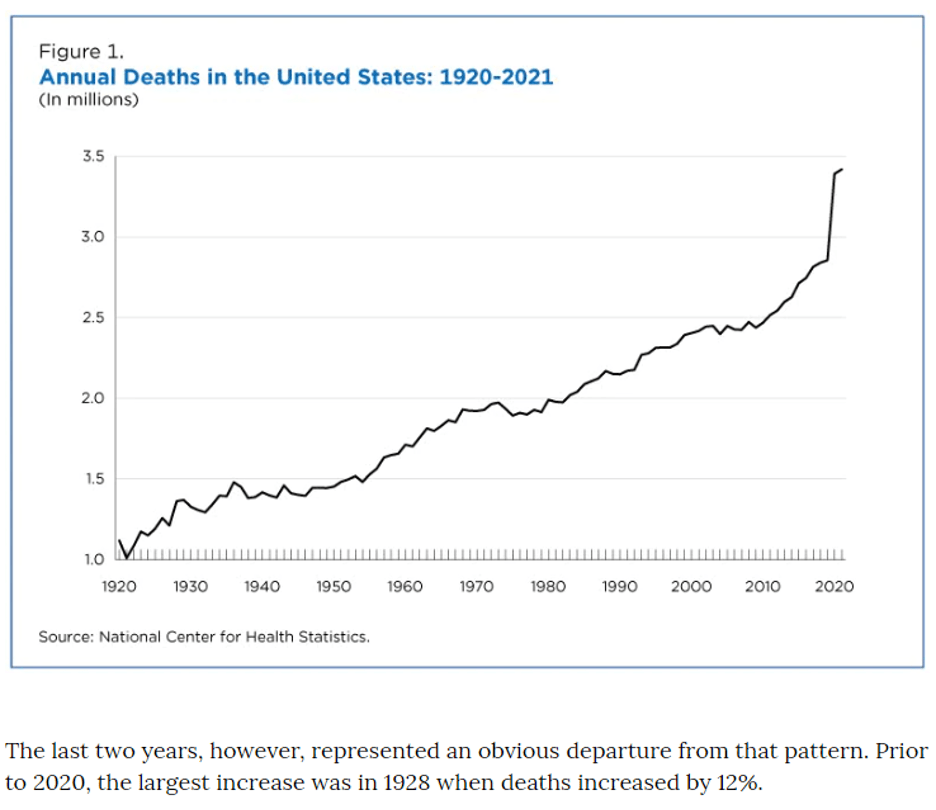 “Deaths in the United States increased by 19% between 2019 and 2020 following the onset of the COVID-19 pandemic in March 2020 — the largest spike in mortality in 100 years.