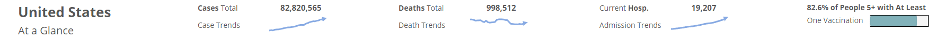 The above graphics show that Community Transmission continues to rise. The week ending May 8, 2022 shows that 56.61% of the counties in the U.S. are now/again at high levels of transmission – a 12.01% change. The week ending May 1, 2022 saw a 10.92% change with the week ending April 24, 2022 a 7.32% change; the week ending April 17, 2022 saw a 6.16% change and the week ending April 10, 2022 a 6.16% change. More counties in the red. Not a good sign! We’re going in the wrong direction – again. This is also borne out by the United States At a Glance – cases and hospitalizations are on the increase.