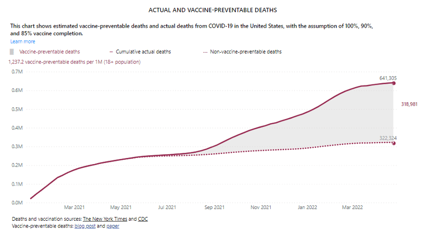 “This dashboard shows the number of vaccine preventable deaths per 1 million residents for each state as well as nationally. It is based on an analysis by our team at the Brown School of Public Health, in collaboration with Brigham and Women’s Hospital, Harvard T.H. Chan School of Public Health, and Microsoft AI for Health showing that between January 2021 and April 2022, vaccines could have prevented at least 318,000 Covid-19 deaths. This means that at least every second person who died from Covid-19 since vaccines became available might have been saved by getting the shot.