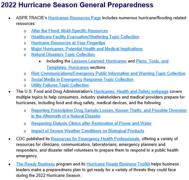On a related note, ASPR (Assistant Secretary for Preparedness and Response) provides the Healthcare and Public Health Sector – 2022 Hurricane Season Preparedness. This landing site has a wealth of information for all areas in the United States that are impacted by hurricanes, including: