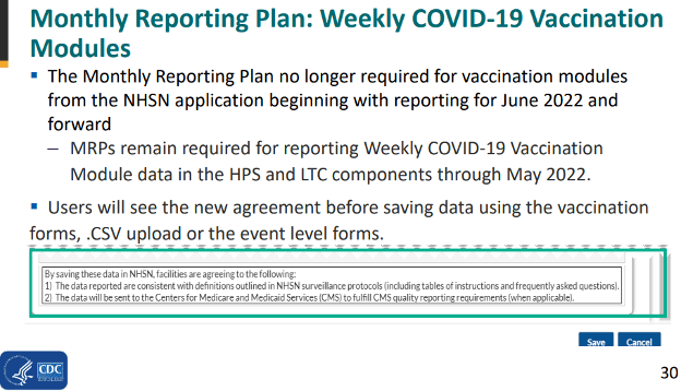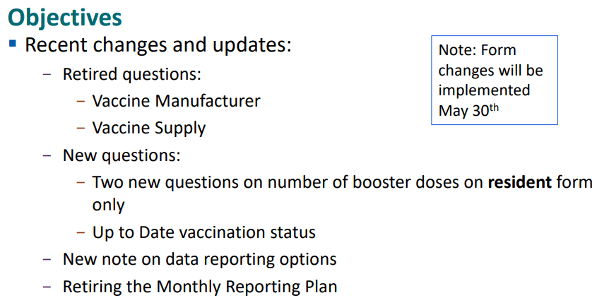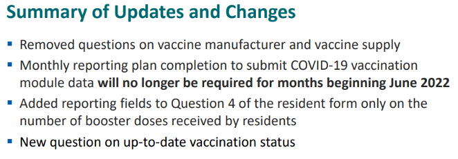 NHSN has posted the Long-term Care Weekly COVID-19 Vaccination Reporting Changes and Updates slides that correspond with the update provided in late May.