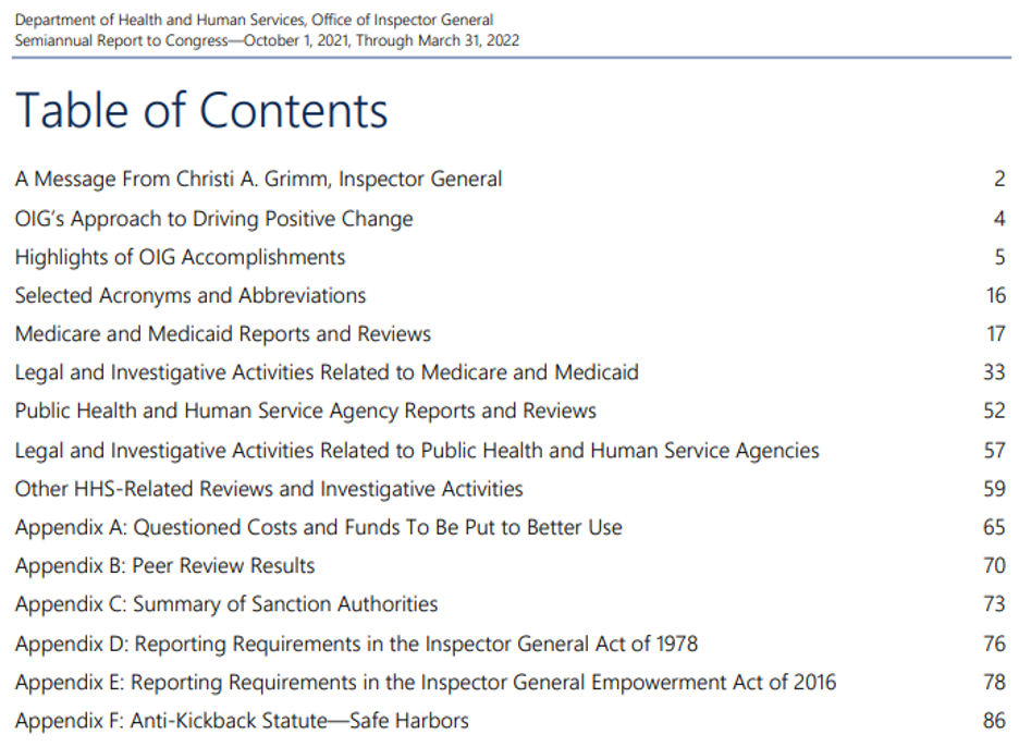 The Spring 2022 Semiannual Report to Congress (SAR) highlights nearly $3 billion in expected recoveries as a result of HHS-OIG audits and investigations. The report also provides an overview of HHS-OIG’s activities from October 1, 2021, through March 31, 2022.