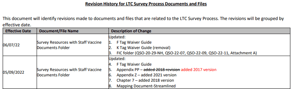 The Revision History for LTC Survey Process Documents and Files is found here. CMS corrected the version of Appendix PP back to the 2017 (2018 revision was a typo) for the May 2022 update.