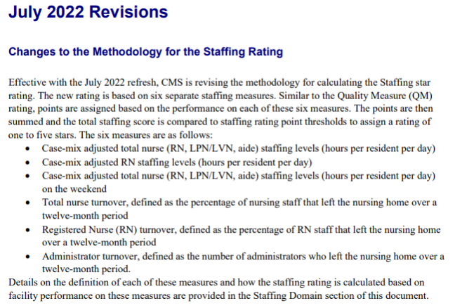 Additional details regarding the staffing rating methodology are included in the July 2022 Nursing Home Five-Star Quality Rating Technical Users’ Guide (36 pages).