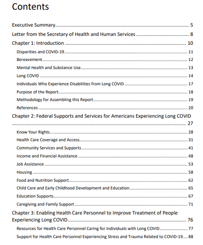 • Individuals dealing with the loss of family members or loved ones to COVID-19. The report serves as an initial resource guide to help individuals, their families, and caregivers find needed supports, services, and reasonable modifications to receive health care and treatment, work, go to school, and stably live in the community. It is also useful for community organizations, health care enterprises, and public health agencies who work with individuals experiencing longer-term effects of COVID-19. It will inform the development of additional resources and tools created by the federal government for individuals, families, and communities to navigate the federal supports and services available to them.”