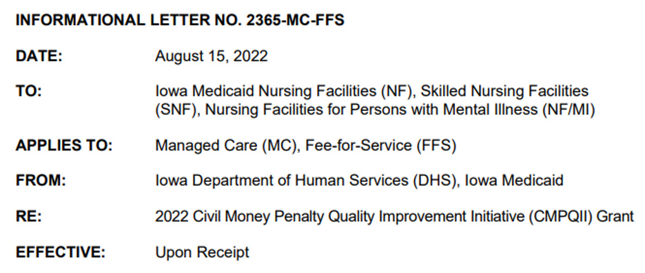 For the complete requirements and for interested qualified parties wishing to apply, please see the Request for Proposal for Civil Money Penalty Quality Improvement Initiative Grant on the State of Iowa Bid Opportunities website[1].