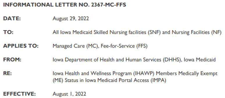 Iowa Medicaid issued guidance in Informational Letter 2318-MC-FFS regarding IHAWP member eligibility for SNF and NF services. Iowa Medicaid has implemented a ME status lookup function within IMPA. The look-up function will allow SNF and NF providers the ability to look up an IHAWP member’s ME status when the individual is admitted to their facility. Ongoing changes to an IHAWP member’s ME status will be displayed for providers to monitor. The Medicaid member must be a resident of a provider’s facility for that provider to access this information in IMPA.