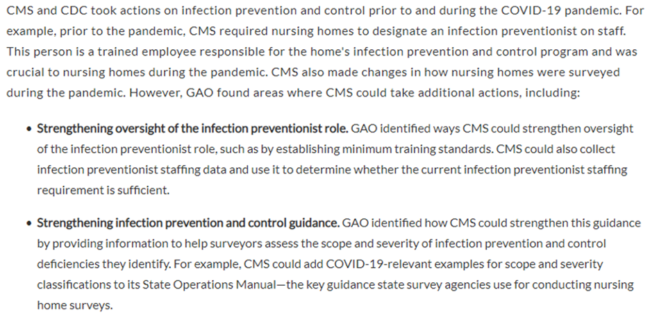 Wednesday, September 14, 2022, the GAO posted its review (same title as this blog) of infection prevention and control in nursing homes. The document is 61 pages in length. A corresponding 7- minute podcast is found here.