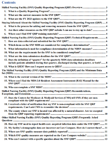 An update to the Skilled Nursing Facility (SNF) Quality Reporting Program (QRP) Frequently Asked Questions (FAQs) document is now available. This document has been updated to reflect the finalized policies for the SNF QRP in Fiscal Year (FY) 2023 and includes other useful resources available to providers.