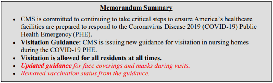 CMS posted QSO-20-39-NH … Nursing Home Visitation (Revised) on September 23, 2022.