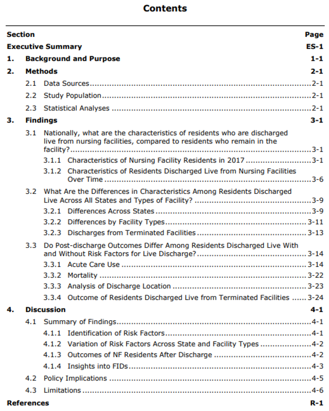 People can be discharged from nursing homes for many reasons. Discharges may be a positive outcome that reflects an individual’s choice. In other cases, discharges may be at the direction of the facility and against the will of the resident. There are strict rules about when involuntary facility-initiated discharges (FIDs) are allowed. FIDs may be unsafe and traumatic for the residents involved and may result in higher costs of care, raising concerns to the public and to Medicare and Medicaid programs. Prior to the COVID-19 pandemic, news media and Ombudsman programs reported that FIDs were becoming the leading cause of complaints for nursing home residents. This study identifies resident characteristics related to increased risk of discharges and how these relationships vary across time, states, and facility types. It also presents findings on the relationship between discharges of residents with risk factors and post-discharge outcomes.