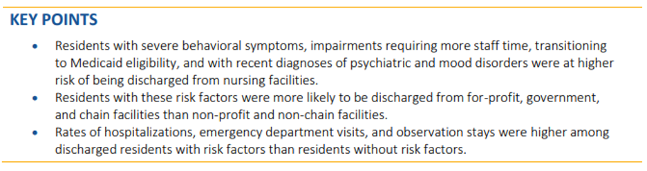 This study identified several resident characteristics associated with a higher risk of discharges from nursing facilities, including behavioral symptoms, impairments requiring more staff time, transitions to Medicaid eligibility, and psychiatric and mood disorders, especially when these conditions newly developed or worsened in the past year. However, for many of these risk factors, the prevalence and strength varied across states and facility types. For profit, government and chain facilities were more likely to discharge residents with risk factors than non-profit and non-chain facilities. We also found that residents discharged with these risk factors, particularly severe behavior symptoms and impairments requiring more staff time, experienced higher rates of acute care (hospitalizations, emergency department visits, and observational stays) than residents discharged without these risk factors.