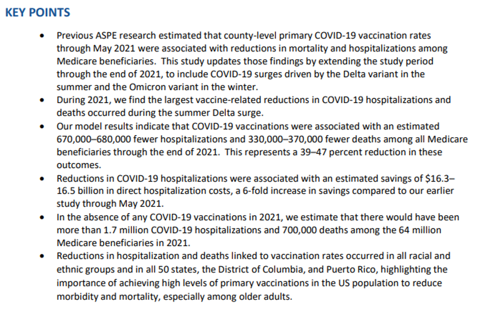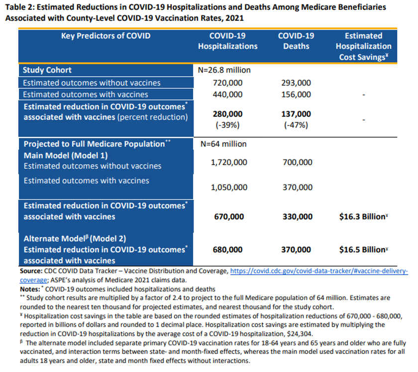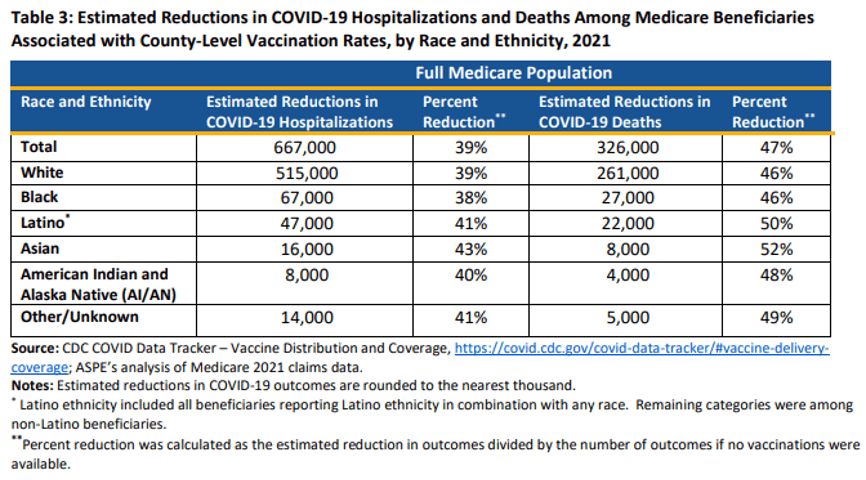 This (16-page) study updates ASPE’s previous analysis of the associations between COVID-19 hospitalizations and deaths among Medicare beneficiaries and COVID-19 vaccination rates, with full year data through the end of 2021. The study uses a combination of person-level Medicare claims and county-level vaccination data to estimate reductions in COVID-19 hospitalizations and deaths among Medicare beneficiaries associated with COVID-19 vaccinations in 2021. We find that vaccines were associated with 670,000-680,000 fewer hospitalizations and 330,000-370,000 fewer deaths among Medicare beneficiaries in 2021, with the largest reductions during the summer Delta surge. This represents a 39–47 percent reduction in these outcomes. Reductions in hospitalization and deaths linked to vaccination rates occurred in all racial and ethnic groups and in all 50 states.