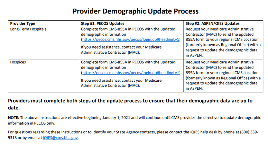 Historically provider demographic data have been maintained in the Automated Survey Processing Environment or ASPEN software; however, CMS will be transitioning to use the demographic information from Provider Enrollment, Chain and Ownership System (PECOS). While this transition is underway, a final date when all demographic data will be obtained from PECOS has not been identified. During this transition, all PAC providers will be responsible to ensure their latest demographic data are updated and available in both ASPEN (SNF/NFs, IRFs, and LTCHs) or iQIES (HHAs and Hospices) and PECOS systems.