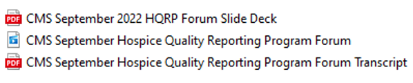 On Wednesday, September 28, 2022, the Centers for Medicare & Medicaid Services (CMS) hosted the September 2022 HQRP Forum to provide information on the Fiscal Year 2023 Hospice Final Rule, recent public reporting activity, and additional HQRP updates. Materials from this HQRP Forum, including a recording of the presentation, are now available in the Downloads section of the Provider and Stakeholder Engagement page at: https://www.cms.gov/Medicare/Quality-Initiatives-Patient-Assessment-Instruments/Hospice-Quality-Reporting/Hospice-QRP-Provider-Engagement-Opportunities.