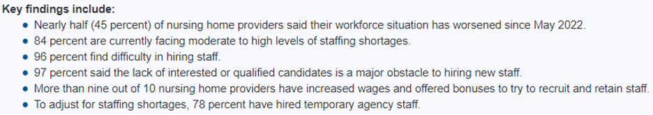 “The American Health Care Association (AHCA), representing more than 14,000 nursing homes and other long term care facilities across the country, released a survey of more than 500 nursing home providers from across the U.S. highlighting how nearly three years into the COVID-19 pandemic, the industry continues to face a serious labor and economic crisis. The survey findings also demonstrate how the crises are impacting access to care for vulnerable seniors and would make it impossible for the industry to meet increasing government staffing requirements without corresponding support.