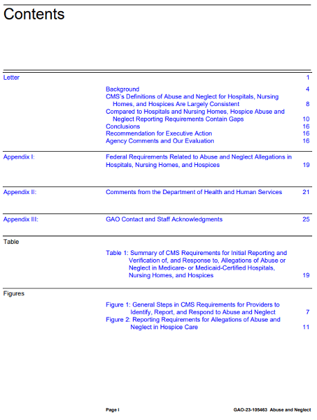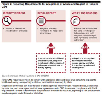 “GAO’s review of Centers for Medicare & Medicaid Services (CMS) requirements for reporting and responding to abuse and neglect allegations found two gaps in the requirements for hospices, compared with requirements for extended care provided in hospitals and nursing homes. Hospices, which can provide care in a patient’s home or other settings, are required to report allegations to the state agencies responsible for monitoring them only if: (1) the alleged perpetrator is affiliated with the hospice; and (2) after the hospice has verified it as abuse or neglect based on an internal investigation that could take up to 5 days. In contrast, nursing homes and hospitals providing extended care are required to report all abuse and neglect allegations, regardless of whether the alleged perpetrator is affiliated with the hospice and prior to conducting an internal investigation.”
