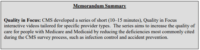 CMS performs over 100,000 compliance surveys of Medicare and Medicaid-certified providers and suppliers, each year. To increase compliance with CMS’ health and safety regulations, CMS has used the findings from those surveys to inform a series of short (10–15 minutes) Quality in Focus interactive training videos tailored for specific provider types. The intent of this initiative is to provide a resource for providers and suppliers to proactively address common compliance concerns and therefore increase the quality of care for patients and residents.