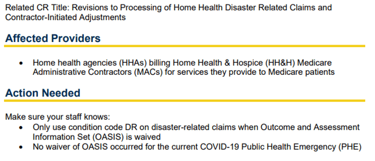 When disaster conditions (such as hurricane or wildfire) make submission of OASIS assessments impossible, Medicare may issue a waiver indicating OASIS submission is waived. In this case, HHAs should report condition code DR on their claim to show billing under the waiver. Since the OASIS assessment can’t be submitted, the HHA can’t report occurrence code 50 to show the assessment completion date. We’ll accept claims without occurrence code 50 if condition code DR is present.