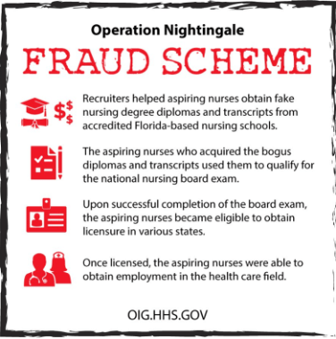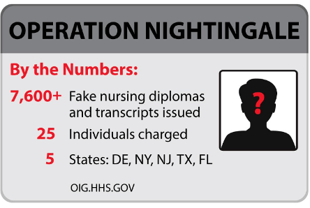 On January 25, 2023, the U.S. Department of Health and Human Services Office of Inspector General (HHS-OIG) and our law enforcement partners launched a multi-state coordinated law enforcement action to apprehend individuals engaged in a scheme to sell false and fraudulent nursing degree diplomas and transcripts. The enforcement action resulted in the execution of search warrants in Delaware, New York, New Jersey, Texas, and Florida, and 25 individuals being charged for their involvement in the fraud scheme.