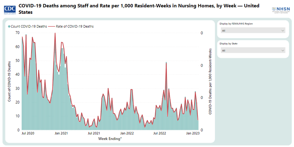 The NHSN Nursing Home COVID-19 Data Dashboard provides this data as of January 30, 2023 at 5:30am ET: