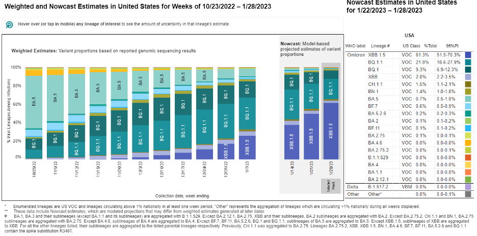 - The most prevalent Omicron lineage this week is XBB.1.5, projected to be approximately 60% (95% PI 51.5-70.3%). The second most prevalent lineage is BQ.1.1, projected to be at approximately 22% (95% PI 16.6-27.9%).