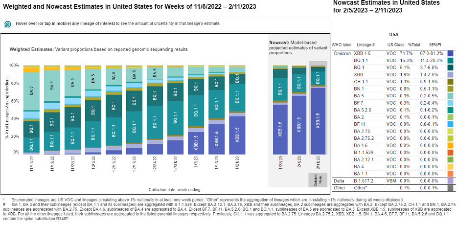 - The most prevalent Omicron lineage this week is XBB.1.5, projected to be at approximately 66.4% (95% PI 59.8-72.5%). The second most prevalent lineage is BQ.1.1, projected to be at approximately 19.9% (95% PI 16.2-24.1%).