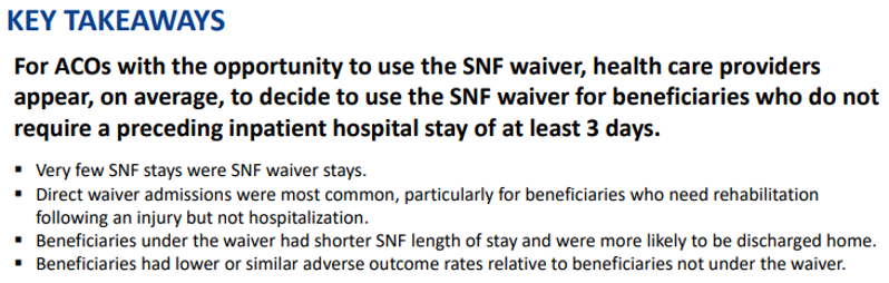 A new CMS analysis describes trends in use and outcomes associated with waiving the 3-day (two nights) stay requirement at an acute care hospital before discharge to a skilled nursing facility (SNF). The 3-day waiver for certain accountable care organizations (ACOs) allows providers to admit patients to certain SNFs directly from the community or after only one to two days in a hospital. The analysis finds shorter SNF lengths of stay and higher rates of discharge-to-home for waiver stays as well as lower or similar rates of adverse outcomes relative to non-waiver stays.